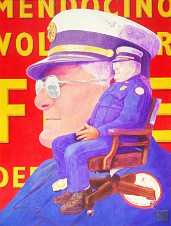 Foggy Gomes (1992). Portrait of Chief Eugene “Foggy” Gomes, Matt Leach’s gift to the Mendocino Volunteer Fire Department. Reflected in the Chief’s spectacles: the iconic redwood sculpture of Time and the Maiden, the emblem of Mendocino, atop Mendocino’s Masonic Hall. The painting is on view at the firehouse on Lansing Street in Mendocino. Best time to see it: the Mendocino Fire Department’s Pancake breakfast next Fourth of July. Acrylic on canvas (64” x 48”). Signed: Leach. Stevenson/Leach-Studios. SKU: CS199210ML
