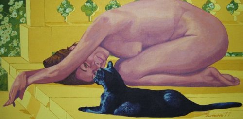 Sandra Hawthorne and Her Cat by Charles Marchant Stevenson (1977). Acrylic. Private collection.