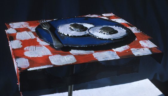 Iron Breakfast. Polychrome table in mixed metals (20″), by Fran Moyer (1969). Private collection.