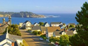 Lansing Street in the village of Mendocino, looking south across Mendocino Bay toward Chapman’s Point. Photo: Wikipedia.