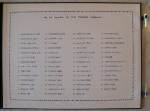 “This map shows the path of the Tokaido, and the location of each station. The stations are numbered starting from the Tokyo end, and the numbering conventionally includes the start and termination as well as the stations; for this reason, most print series showing the stages of the Tokaido actually include 55 images.” J. Noel Chiappa